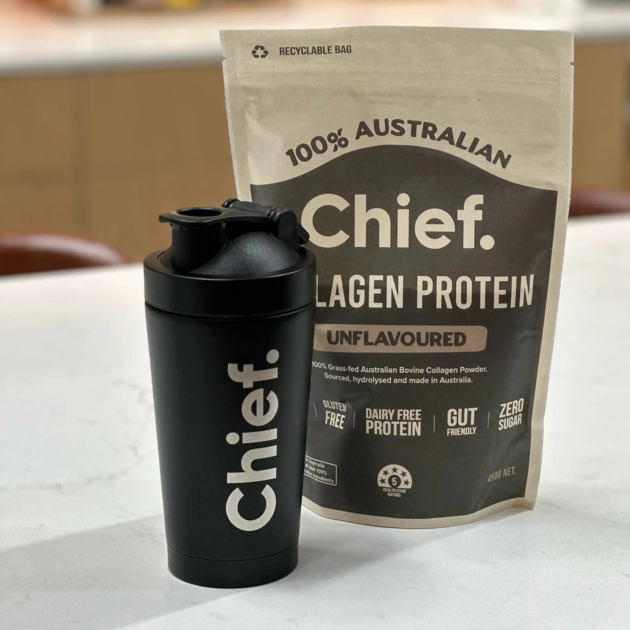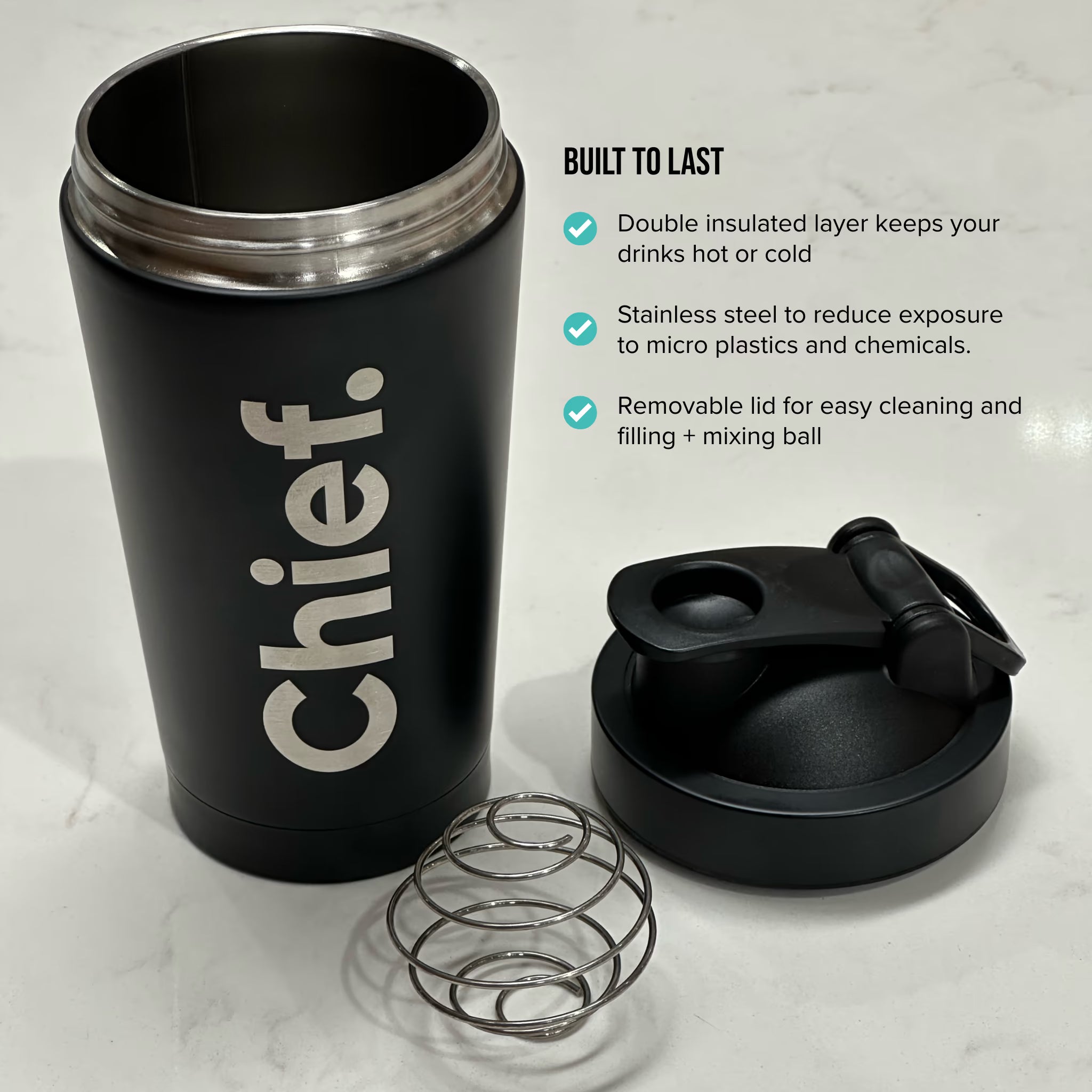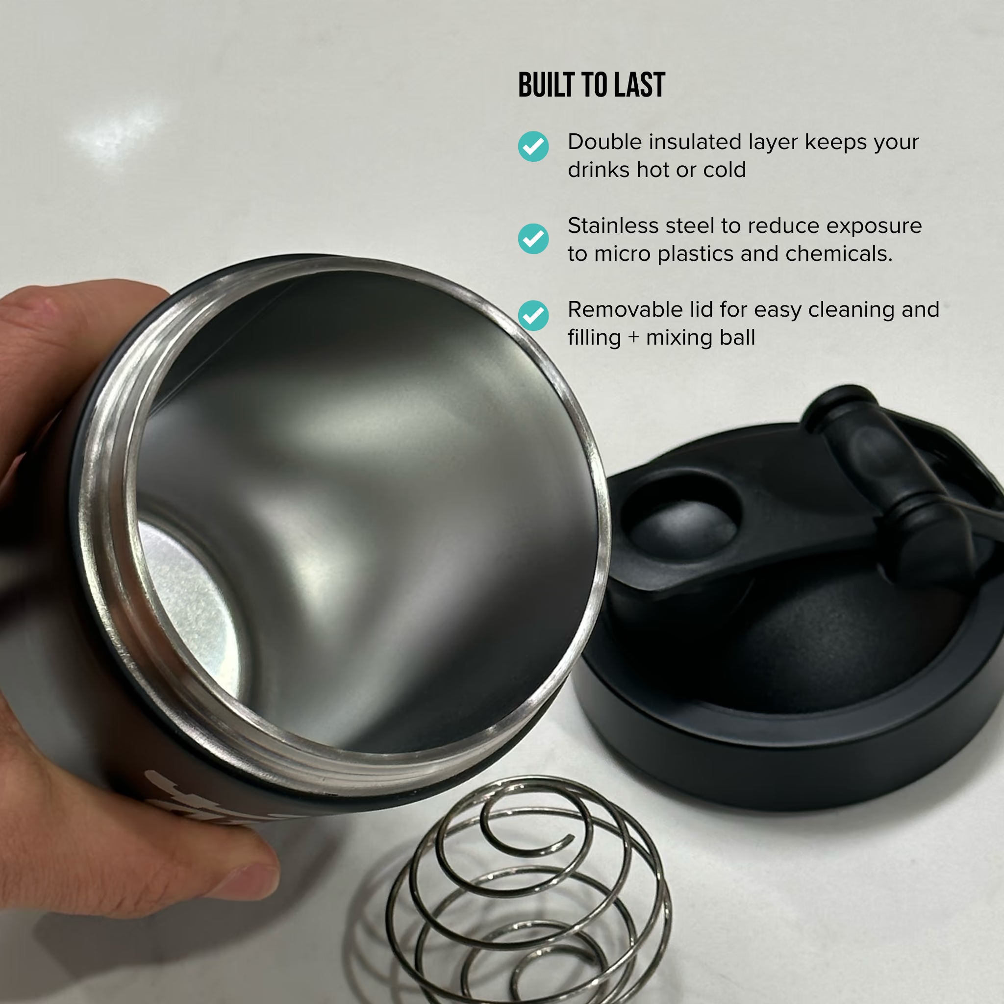 - Premium stainless steel design – Durable, odour-resistant and a sustainable alternative to plastic shaker bottles
